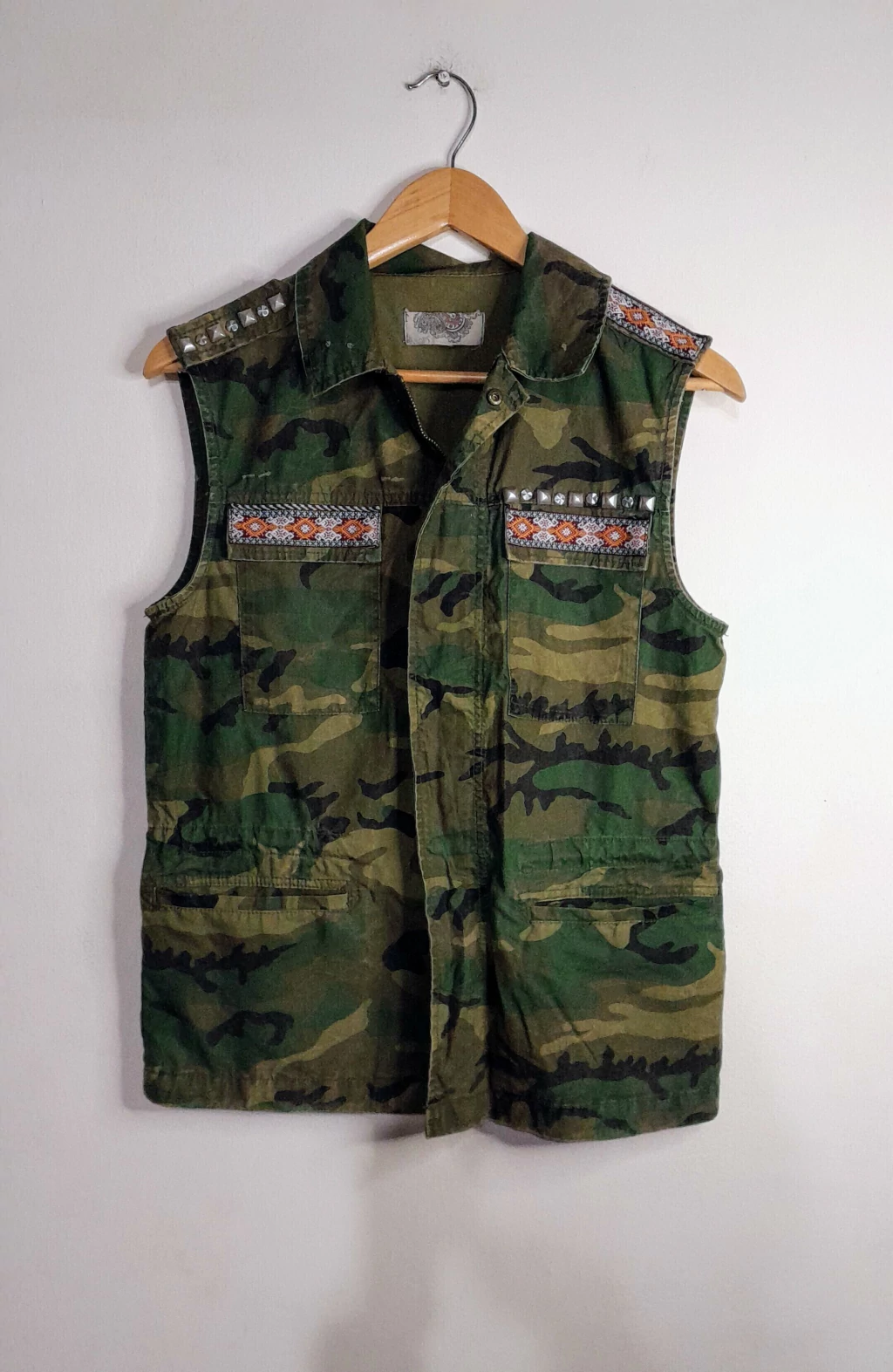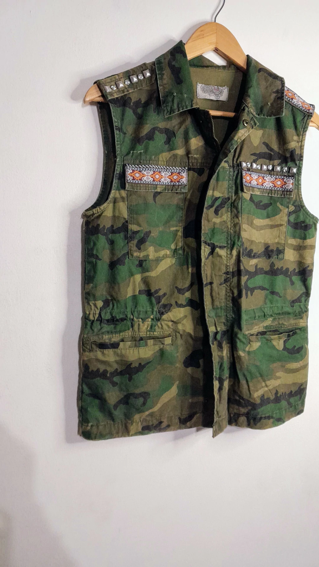Chaleco marca Ecoté - Talle M Descubre el chaleco camuflado con tachas de la marca Ecoté, una prenda que combina estilo y funcionalidad.