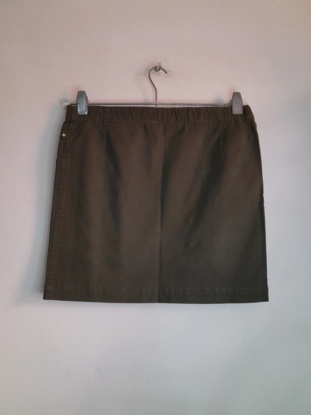 Pollera talle 3 elastizada con elástico en la cintura, color verde militar ,medidas de la prenda de frente sin estirar cintura 38cm, cadera45cm, largo 40cm.